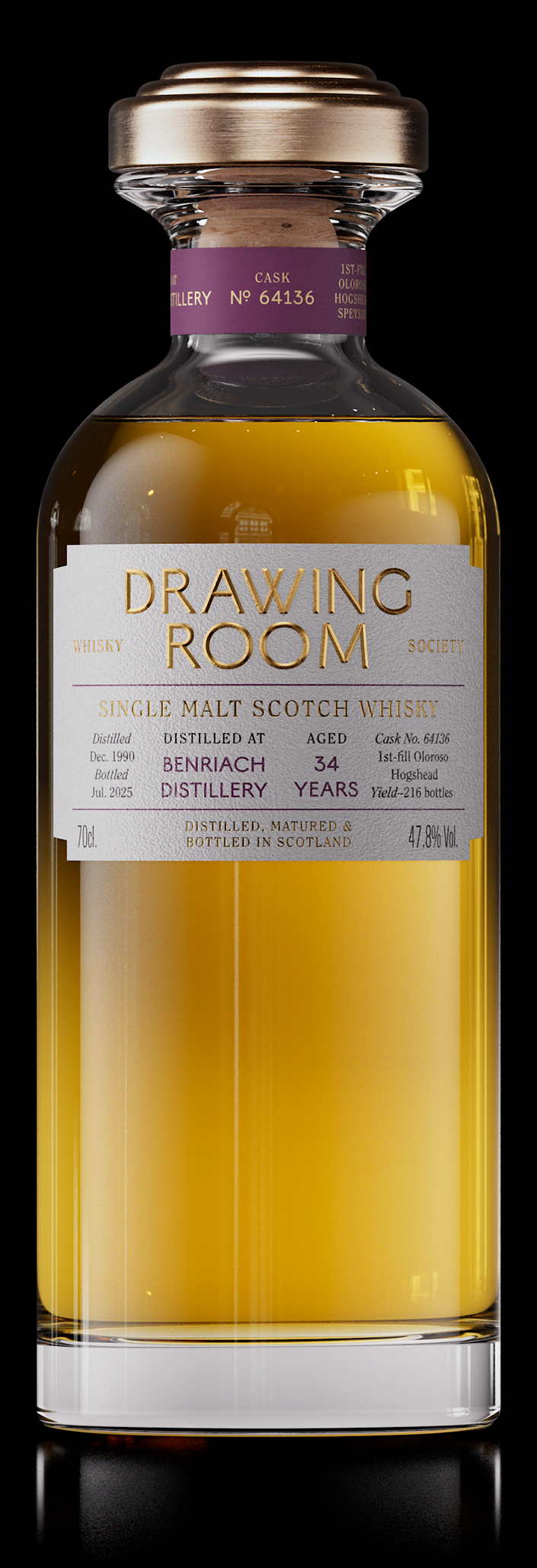 This rare Benriach single cask from the Gallery Collection reveals a palate of dried figs, roasted pineapple, and dark chocolate fudge, layered with nutmeg and vanilla, evolving into a long finish of spiced ginger, cocoa, and delicate smoke. Bottled at natural cask strength, this exceptional 34-year-old whisky captivates with its rich sherry influence and depth, leaving a lasting impression.